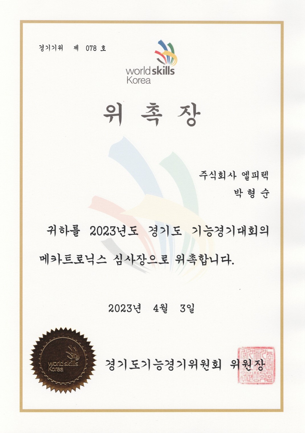 23년도 경기도 메카트로닉스 심사장 작성자관리자 등록일 23-04-13 조회957회 본문 23년도 경기도 기능경기대회 메카트로닉스 심사장 위촉 한양대 ERICA 투자 IR대회 상장 연구개발전담부서 인정서 목록